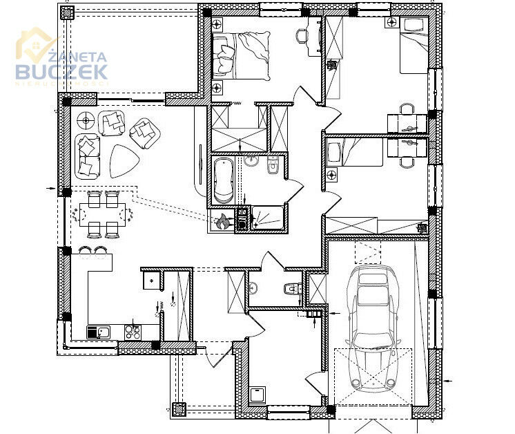 Prawą część domu zajmują 3 pokoje sypialniane dostępne z korytarza w tym jeden z własną garderobą. Dodatkowo w części sypialnianej wyodrębniona została wygodna łazienka z prysznicem i wanną. Pralnia została zaplanowana w pomieszczeniu gospodarczym. Pomieszczenie gospodarcze stanowi dodatkowo bufor przejściowy do garażu.